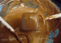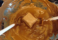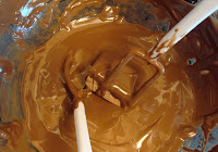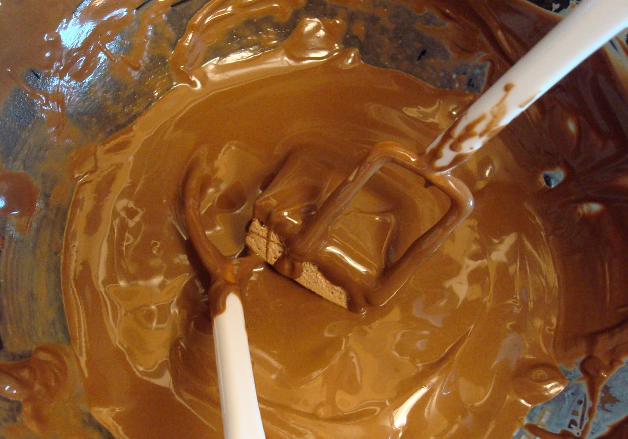 Melt chocolate candy melts in a bowl set over simmering water. Remove from the heat and dip the nougat squares in chocolate, following the pictures below to achieve the waved tops.