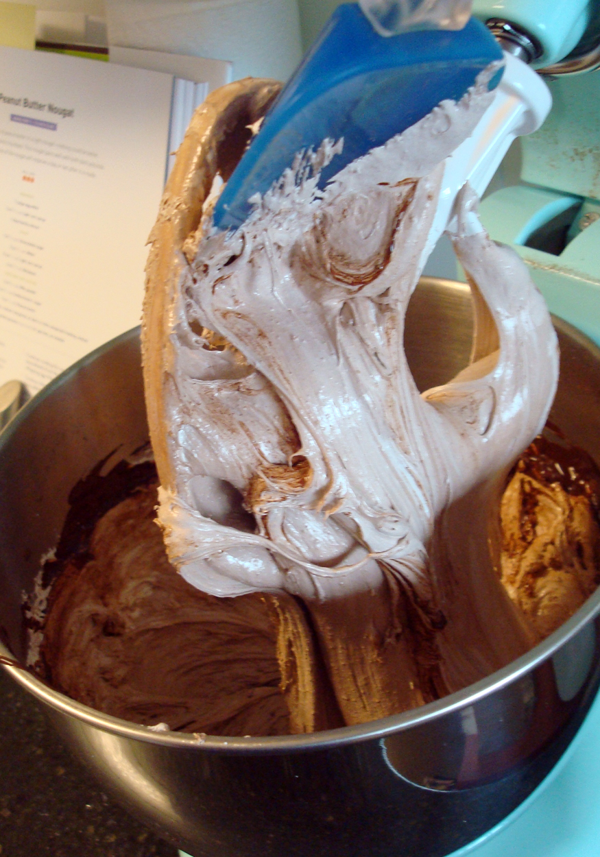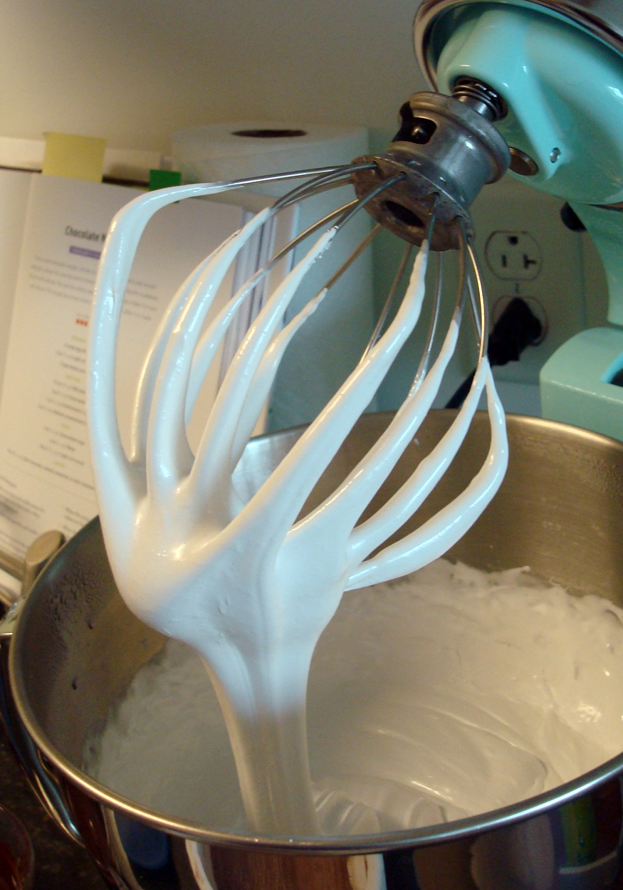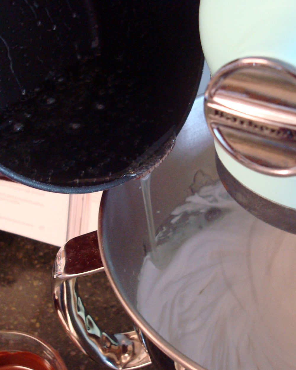 Oil a 9×13-inch pan and set aside. Mix together egg whites, corn syrup and vanilla in the bowl of your stand mixer (or just a regular bowl if you’re using a hand mixer). Sift together the milk powder, cocoa powder and powdered sugar. Melt the unsweetened and bittersweet chocolate in the microwave. Mix the sugar, corn syrup and water in a medium pot. Now all of the ingredients are ready to go!