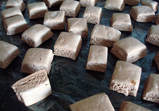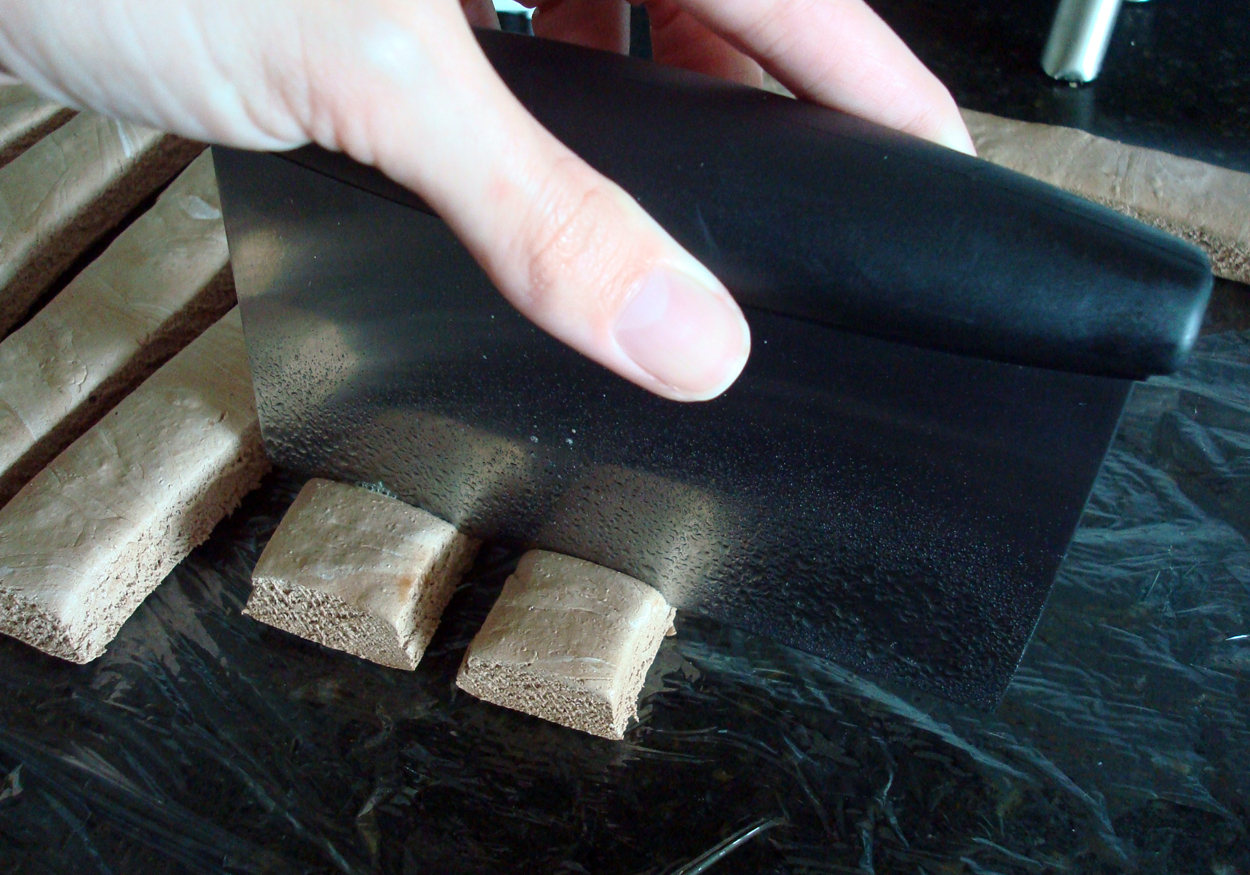 Turn out the slab of chocolate nougat onto the countertop. Using a big knife, cut the slab into strips. Then use the same knife, or a bench scraper, to cut the strips into squares.